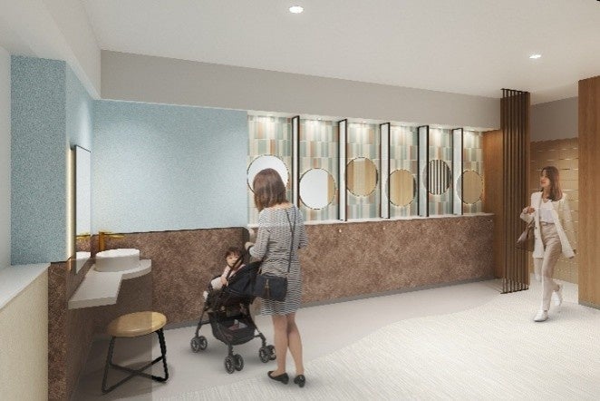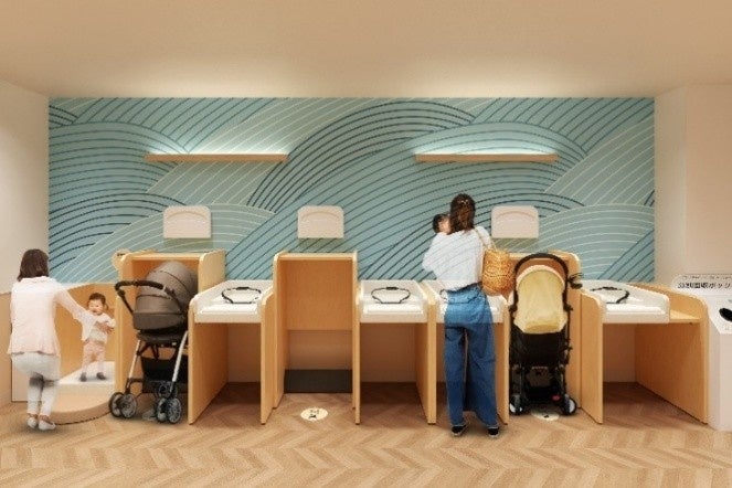 各フロアのベビールームを、和泉市の北部に広がる暮らしや文化の風景と、南部に残る自然豊かな里山の風景という、南北で異なる土地の個性に着目し、土地・風土の雰囲気を取り入れた温かみのあるデザインにリニューアル。機能面でも、ベビーカーで使いやすいおむつ台や、お子さまのお着替えがしやすい着替え台、授乳イス・授乳ソファの一新など、ファミリーにとって嬉しい、使いやすいベビールームに生まれ変わります。あわせて、3階東側(フードコート横)の女子トイレ内のパウダースペースも改装し、身支度の時間も心地よく過ごせる空間とします。