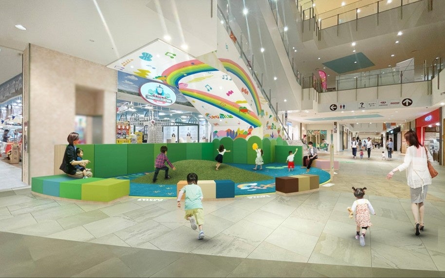 2階の遊び場は、笑顔とにぎわいが広がる楽しい空間へと生まれ変わります。既存の「こもれびHOUSE」には、小さなお子さまが安心して遊べるマットエリアを新設し、壁付けのおもちゃも一新。さらに、トーマスステーション/namco横に、芝生のお山をイメージした開放的な遊び場「こもれびHILL」を新設し、年齢に応じて遊べる環境を整備します。また、今回の遊び場のグラフィックは、和泉市在住のアーティスト小宮 さえこさんに制作いただきました。