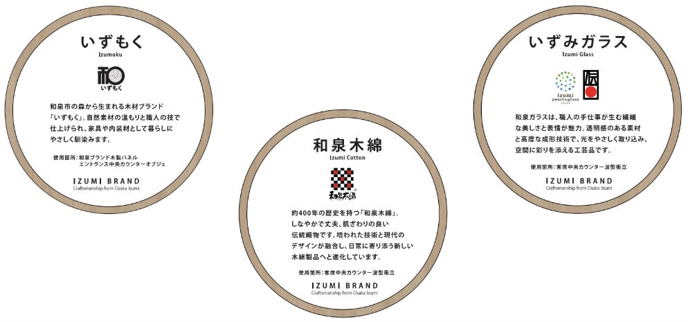 また、フードコートでは地域に根差した商業施設の取り組みとして、和泉市の文化的資産や産業を取り入れています。エントランスゾーンのラウンドテーブルでは、”いずもく” で和泉市の輪郭をかたどった積層パネルとサインを設置し、中央エリアのカウンター席の衝立には、色鮮やかな“和泉木綿”と“いずみガラス”を使用しています。