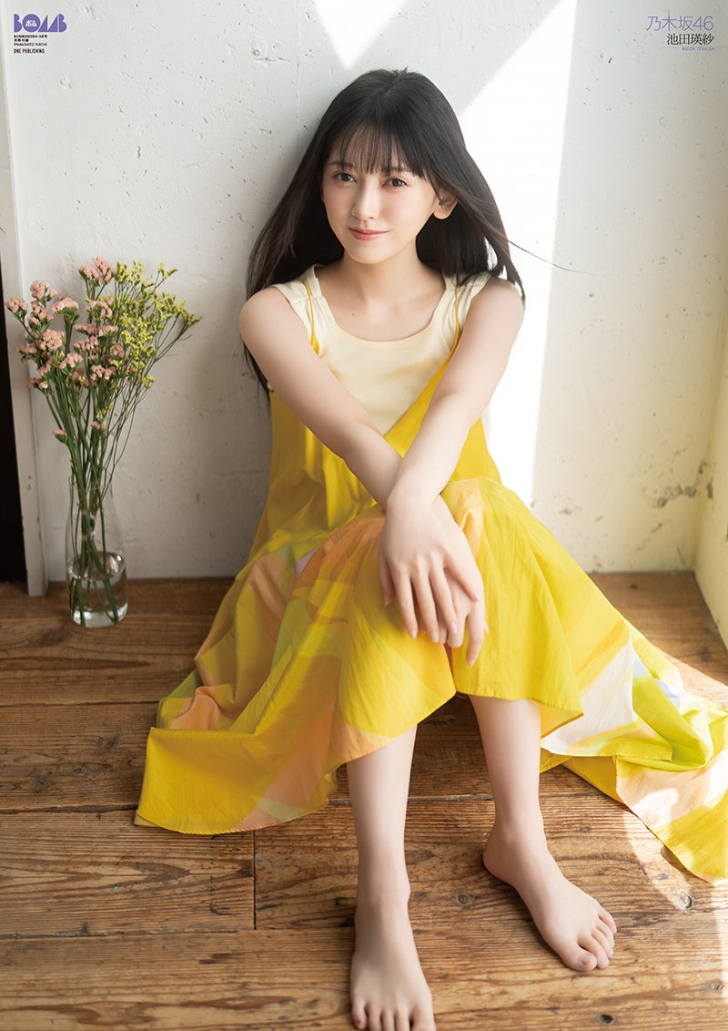★ボム4・5月号の表紙を飾るのは、3月26日に38枚目シングル『ネーブルオレンジ』をリリースする乃木坂46の5期生“てれぱん”こと池田瑛紗。現役芸大生でもある彼女の撮影テーマは、花と色彩。春らしく素肌感のある青いシースルーワンピースでは、青のデルフィニウムを手に光と風を感じながらしっとりと。チューリップ柄の黄色いロングワンピースでは、色鮮やかなお花のサラダを前に大好きなエビをパクリ。一転して大人っぽい真っ赤なニットに着替えて、赤いバラの花びらが舞う世界へ。最後はベッドで紫のノースリーブ&ショートパンツで、紫色のスイートピーの絵を描き笑顔でポーズ。さすがの上手さで、この絵だけでも必見!