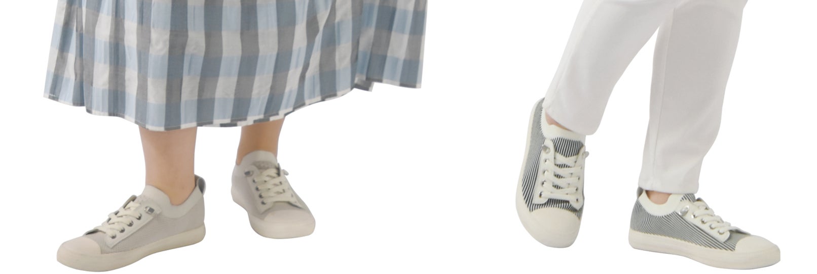 N+の人気商品、低反発ソールフィットスニーカーは、通気性のあるメッシュ素材を採用しており軽やかな履き心地が特長です。靴紐や履き口がゴムで伸縮するので脱ぎ履きしやすく、足にやさしくフィットする低反発インソールもポイントです。2種類のデザインはどれもシンプルで、普段使いはもちろん、さまざまなスタイリングにも合わせやすい一足です。お出かけにも取り入れやすいアイテムですので、ぜひ店頭やオンラインショップでご覧ください。