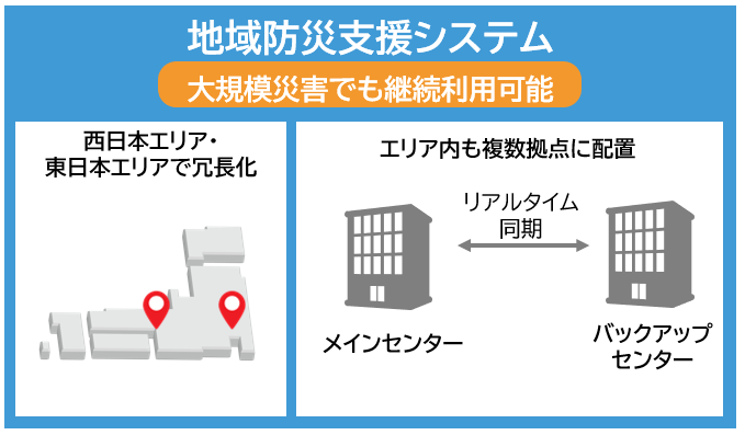 本サービスは、大規模災害でも継続利用できる高い可用性を具備しています。システム接続には、専用端末を介さないWebブラウザ経由に加え、総合行政ネットワーク(LGWAN)経由でも利用可能です。また、システム障害が発生した際は、本サービスの運用に支障をきたさないようデータセンター内で瞬時にシステム切替えが可能なクラウド基盤を採用しています。さらに、堅牢なデータセンターと国内複数拠点での冗長化により、発災時にも安心してご利用いただける環境を提供いたします。