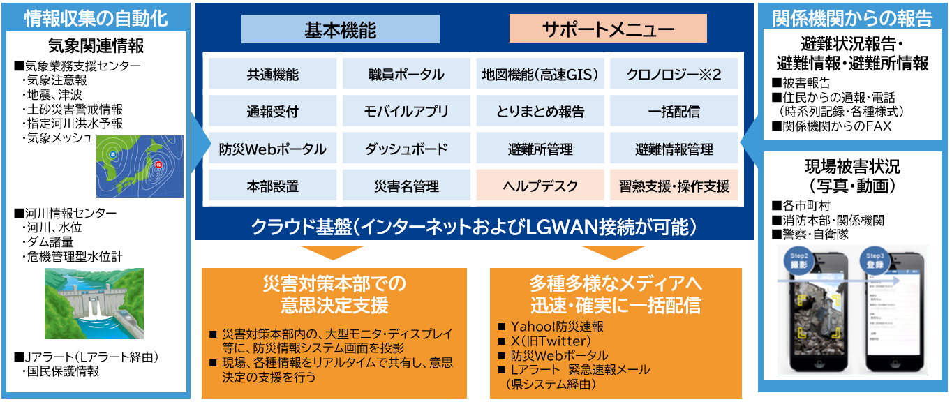 本サービスでは、基本機能を中小規模自治体における災害対応の主要業務に必要な機能に絞り込み、サポート機能として平時の習熟等を支援するメニューを具備しました。
