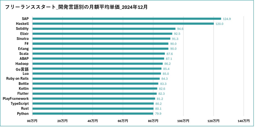 月額平均単価のトップ3は、1位「SAP」が124.9万円(前月比+1.7万円・1.4%増)、2位「Haskell」が120.0万円(前月と同額)、3位「Solidity」が94.6万円(同+1.5万円・1.7%増)でした。