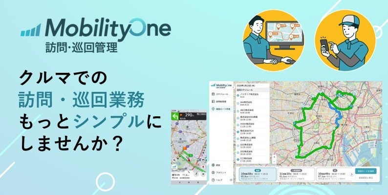 「MobilityOne 安全運転管理」は、アルコールチェックや運転日報などの業務をデジタル化して一元管理でき、社用車に関わる管理業務のDX化をサポートします。「MobilityOne 訪問・巡回管理」は、最適な訪問ルートの作成やスケジュール管理機能で車での訪問・巡回業務を効率化し、生産性向上に貢献します。