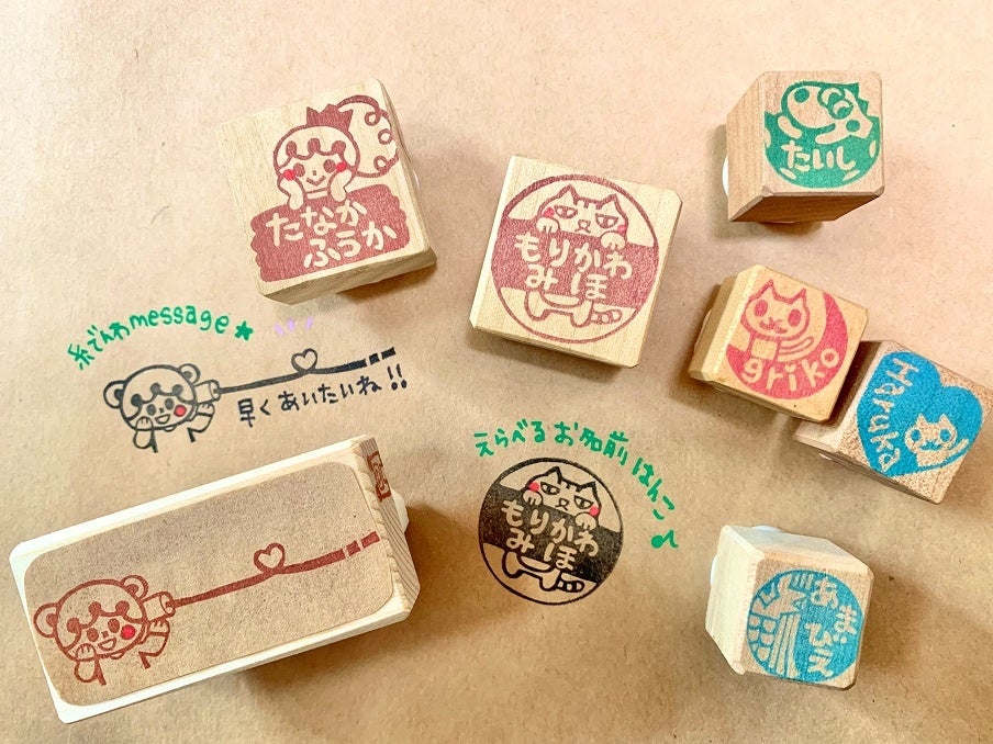 約20タイプから柄を選び、お名前をその場で彫って仕上げまず。糸でんわモチーフのはんこなども販売。