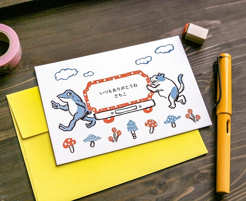 ネコとカエルがパネルを持っているイラスト入りカードにご希望のメッセージを 活版印刷で仕上げます。