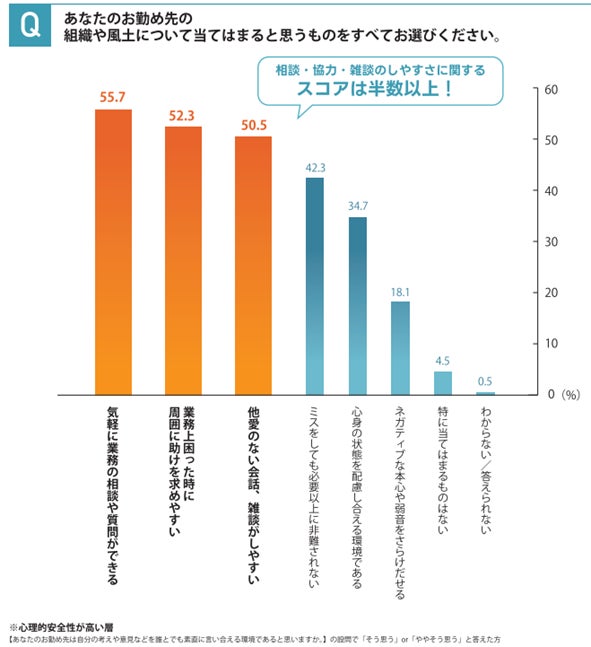 心理的安全性が高い層:結果①における「あなたのお勤め先は自分の考えや意見など誰とでも素直に言い合える環境であると思いますか。」の設問で「そう思う」もしくは「ややそう思う」と回答した方