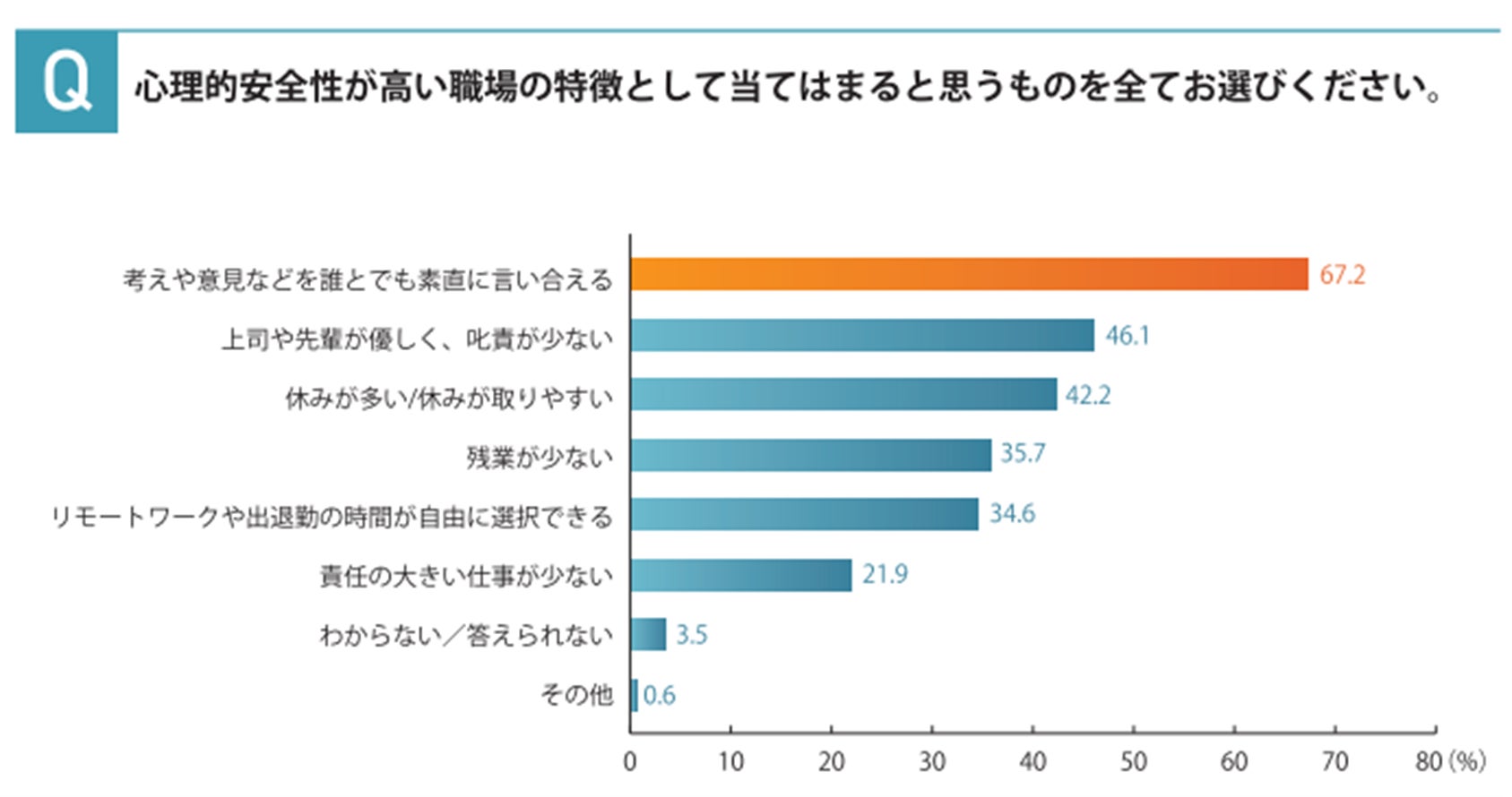 「心理的安全性」(※)という言葉を知っていると答えた方を対象に、心理的安全性が高い職場の特徴として当てはまるものを聞いたところ、「考えや意見などを誰とでも素直に言い合える環境であること」と認識している人は、全体の67.2%であることがわかりました。その次に多かった項目としては、「上司や先輩が優しく、叱責が少ない」(46.1%)、「休みが多い/休みが取りやすい」(42.2%)、「残業が少ない」(35.7%)でした。