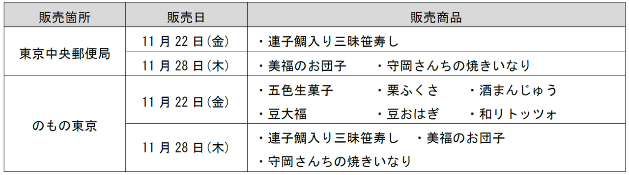 ○日本郵便株式会社(本社:東京都千代田区、代表取締役社長:千田 哲也、以下「日本郵便」)および東日本旅客鉄道株式会社(本社:東京都渋谷区、代表取締役社長:喜㔟 陽一、以下「JR東日本」)は、2024年2月21日(水)に社会課題の解決に向けた協定を締結※し、両社グループの連携強化を進めています。 ○2024年6月に山形、2024年9月に長野を対象とした地産品販売フェアを実施し、好評であったことから、第三弾として2024年11月19日(火)より北陸フェアを開催します。 ○今回は「のもの」で人気の商品や列車荷物輸送サービス「はこビュン」で金沢駅から直送した和菓子・笹寿しなどを、東京中央郵便局および「のもの」東京駅グランスタ丸の内店(以下「のもの東京」)にて販売し、食を通じて北陸エリアの魅力を発信します。 |