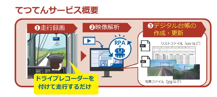 「てつてん®」は、対象の設備がある路線を走る営業列車に搭載したドライブレコーダーで取得した走行データを古河電工独自のRobotic Process Automation(RPA)技術で解析し、鉄道会社が所望する設備の基本情報(全景写真やキロ程、柱番号など)や、巡視点検用の動画をデジタルデータとして提供するソリューションで、鉄道沿線設備の維持管理に貢献します。