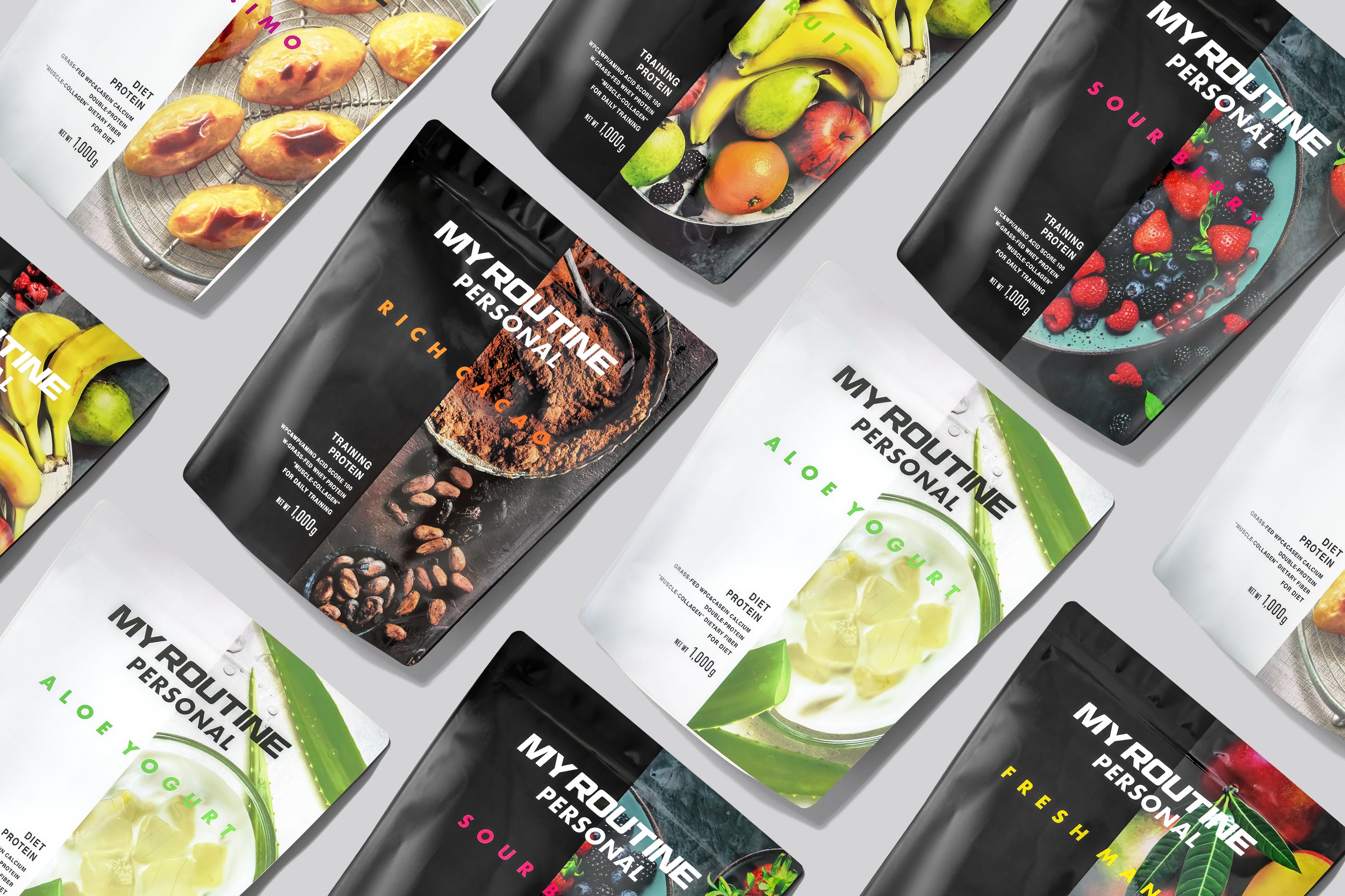 マイルーティーン パーソナル 1kgプロテインは、「一人ひとりのワークアウトにフィットする、自分のためのプロテイン」をコンセプトに、理想のボディを目指したい方におすすめの「TRAINING PROTEIN」と、ダイエットやプロテイン初心者におすすめの「DIET PROTEIN」の2ラインで、全6フレーバーを展開しています。「TRAINING PROTEIN」はリッチカカオ風味、フレッシュマンゴー風味、サワーベリー風味、ミックスフルーツ風味、「DIET PROTEIN」はアロエヨーグルト風味、オイモ風味になります。目的に合わせた商品設計と、スタイリッシュなパッケージデザインがポイントです。
