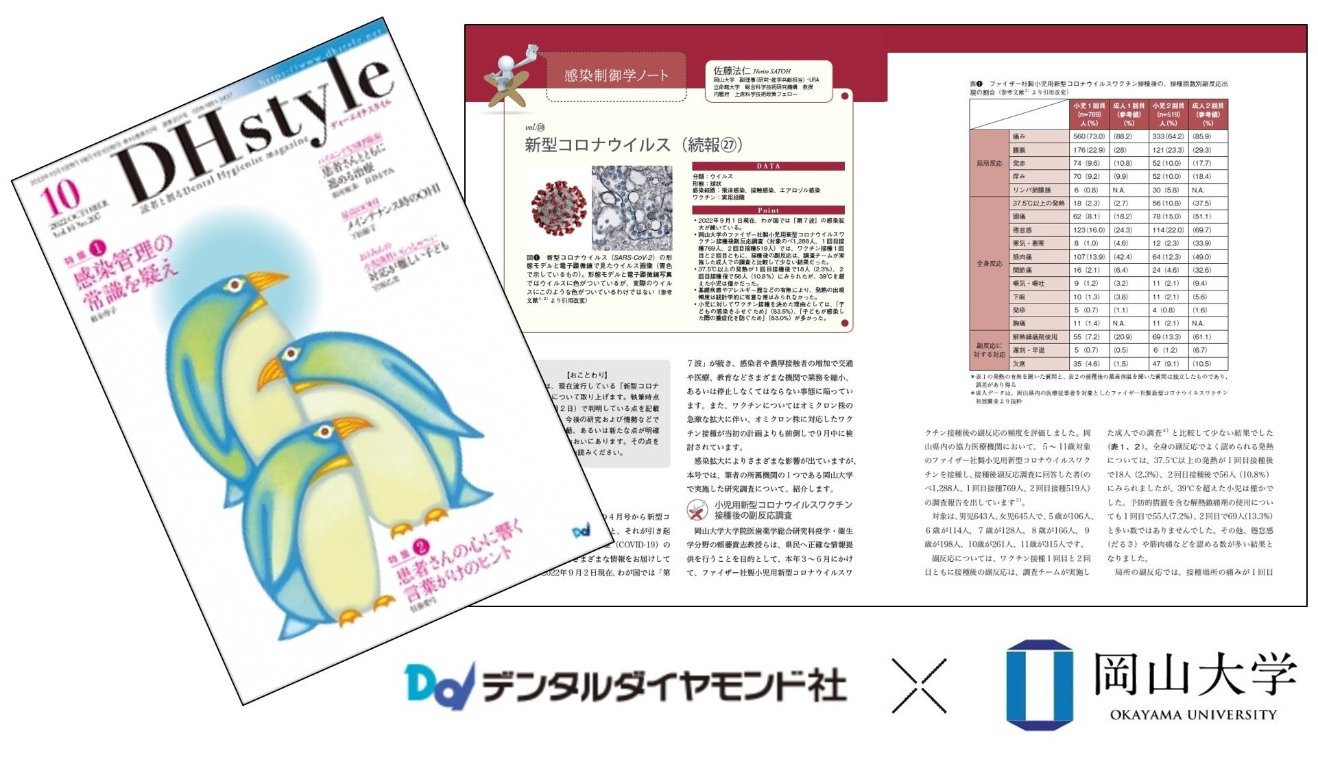 国立大学法人岡山大学(本部:岡山市北区、学長:槇野博史)東京オフィス駐在の佐藤法仁副理事(研究・産学共創担当)・URAは、歯科総合出版社である株式会社デンタルダイヤモンド社(本社:東京都文京区本郷、代表取締役:濵野優)が歯科衛生士向けに発行している月刊誌『DHstyle』に、連載「感染制御学ノート」を2012(平成24)年1月から行っています。