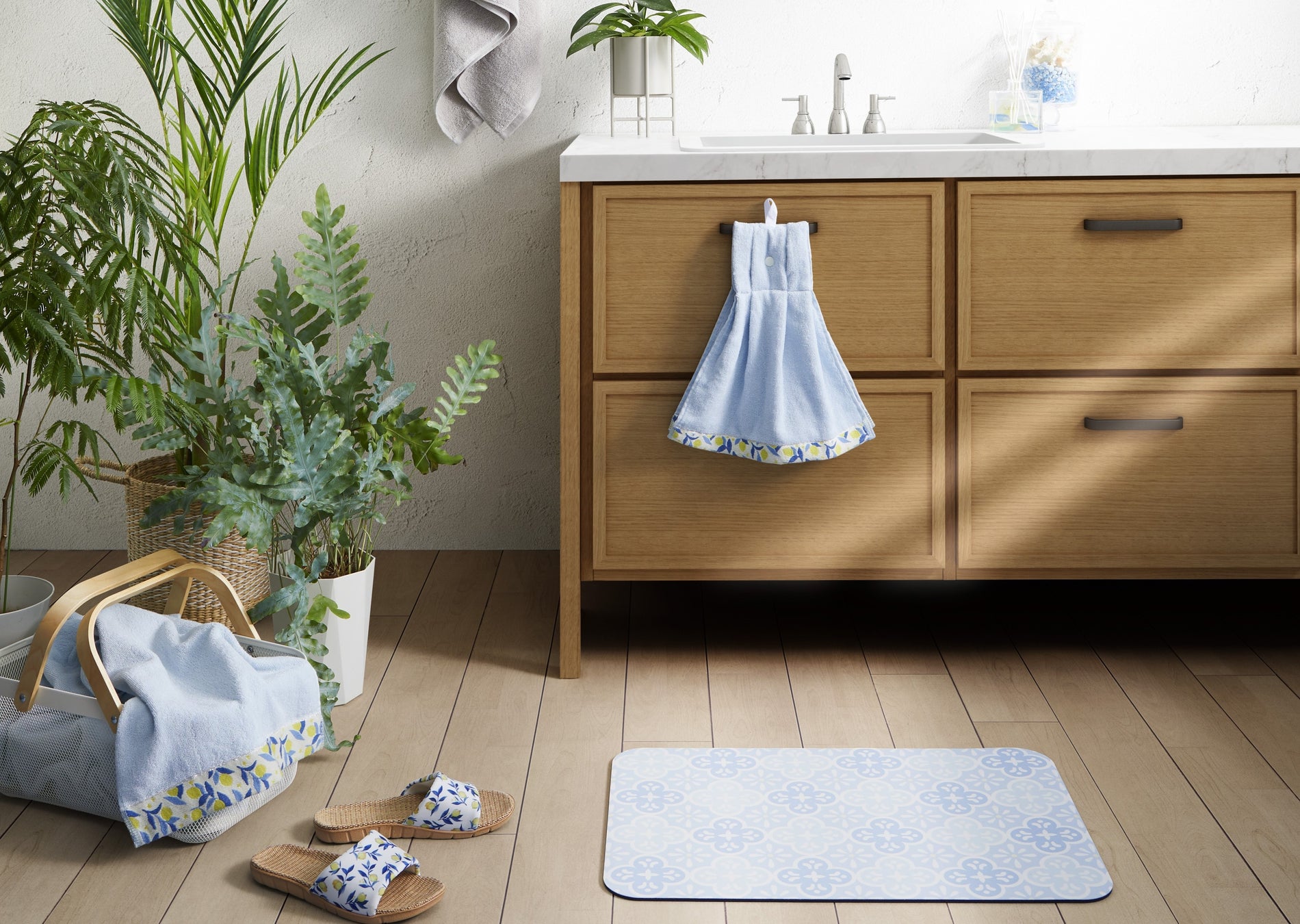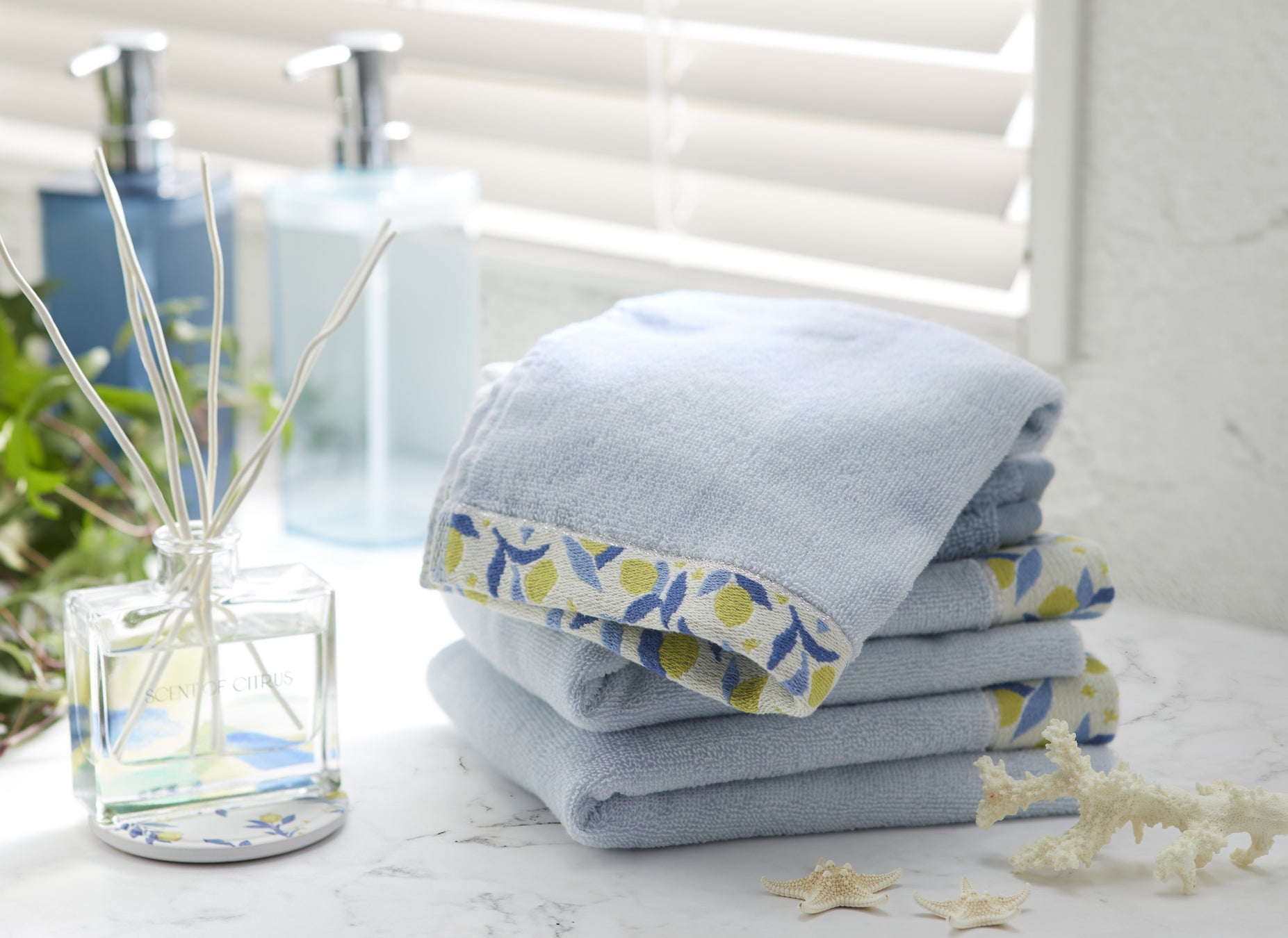 涼しげなブルーのバスグッズに、フレッシュなレモン柄をプラス