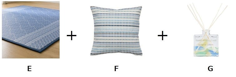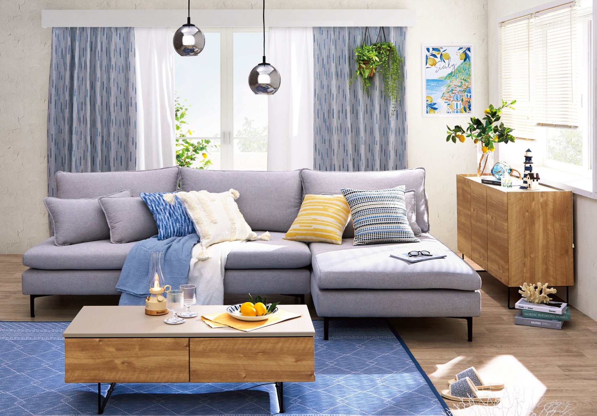足元がひんやり心地よいNクールのラグに、ざっくり織りのクッションとさわやかなシトラスの香りをプラス。涼しげなブルーをつなげて、肩ひじ張らないリラックス感のあるリビングに。