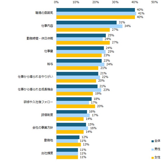 「入社後にギャップを感じた経験はありますか?」と伺うと、87%が「ある」と回答しました。入社後ギャップを感じたことがある方に、「想定より良かったギャップ」を伺うと、上位は「職場の雰囲気」(40%)、「仕事内容」(31%)。「想定より悪かったギャップ」でも、「仕事内容」(39%)、「職場の雰囲気」(38%)が上位に並びました。想定よりも悪かったギャップにおいては、男性よりも女性のほうが「仕事量」で10ポイント、「勤務時間・休日休暇」で9ポイント高い結果となりました。「想定通りだったギャップ」のトップは「勤務地」(37%)でした。