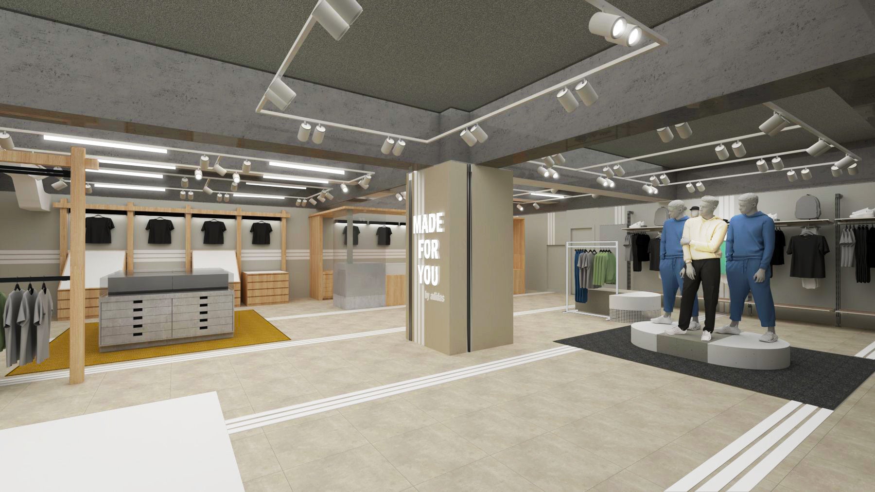 また、世界各地のアディダス旗艦店で展開されてきたカスタマイズサービス「MADE FOR YOU」を国内最大規模で3階フロアを大胆に使用し常設展開します。リニューアルオープン記念として、アーティストZECSさんとYutaka Kobayashiさんによる限定デザインも登場します。来店者全員に特典として、MADE FOR YOUスペシャルデザインステッカーも数量限定で配布予定です。デザイン空間は、アディダスを象徴するスリーストライプスと木造作が融合したモダンな空間に仕上げています。