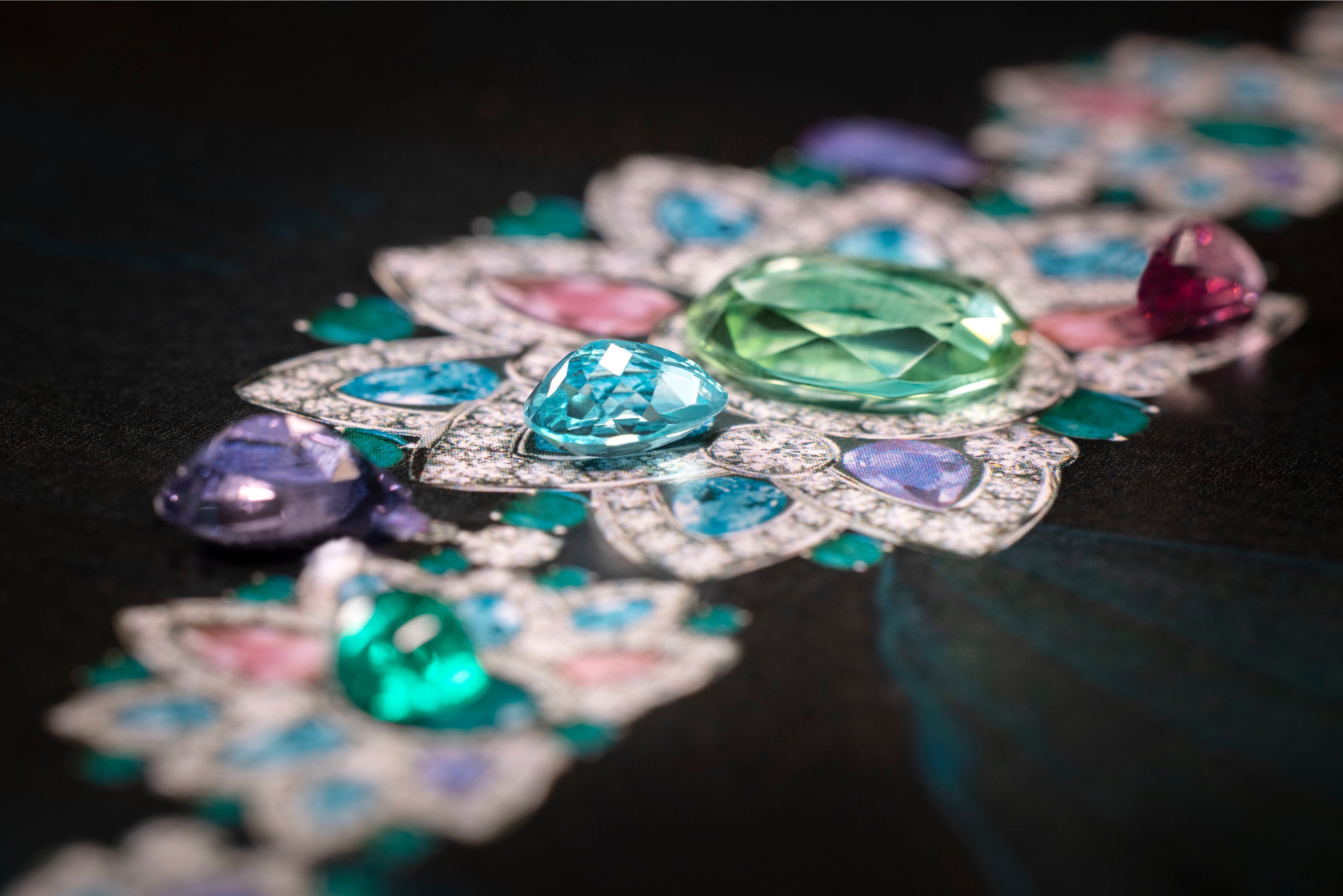 カボションおよびブリリアンカットエメラルド(約8.4ct)、パライバ(約10.7ct)、ピンクスピネル(約10.5ct)、パープルのスピネル(約9.1ct)、F-G VVS-VSラウンドブリリアンカットダイヤモンド(約14ct)、F-G VVS-VSスノーセッティングダイヤモンド(約0.3ct)、ミントグリーントルマリン(約9.6ct)