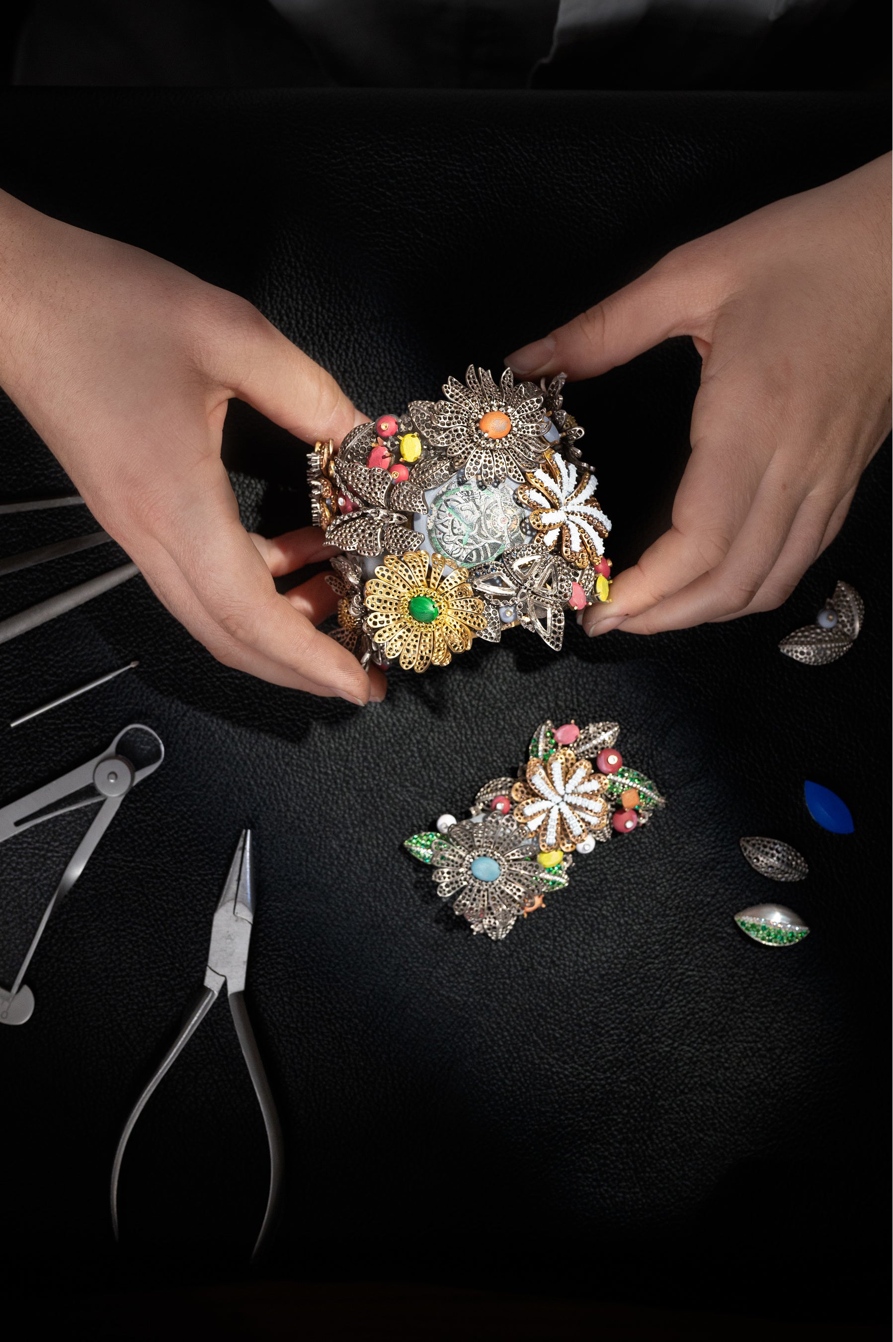 心おどるような優美さ。「ブルーミング ビューティー」のウォッチには、ブルガリならではの斬新なクリエイション力が光ります。可憐に美しく咲く花は、まばゆいスノーセッティングのダイヤモンドにより縁どられ、ダイヤルは9.6カラットのミントグリーントルマリンによってカバーされています。コロンビア産オーバルカボションカットエメラルド、パライバトルマリン、ピンクやパープルのスピネル、そしてラウンドブリリアンカットのダイヤモンドが、やわらかに腕に添うプラチナブレスレットの上で華やかに瞬きます。