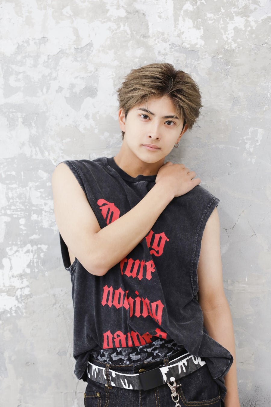 普段のけんけんとは違う、トレンドのワイドパンツを中心に、ベルトやウォレットチェーンの小物使いが目を惹くストリートスタイルを身にまといます。
