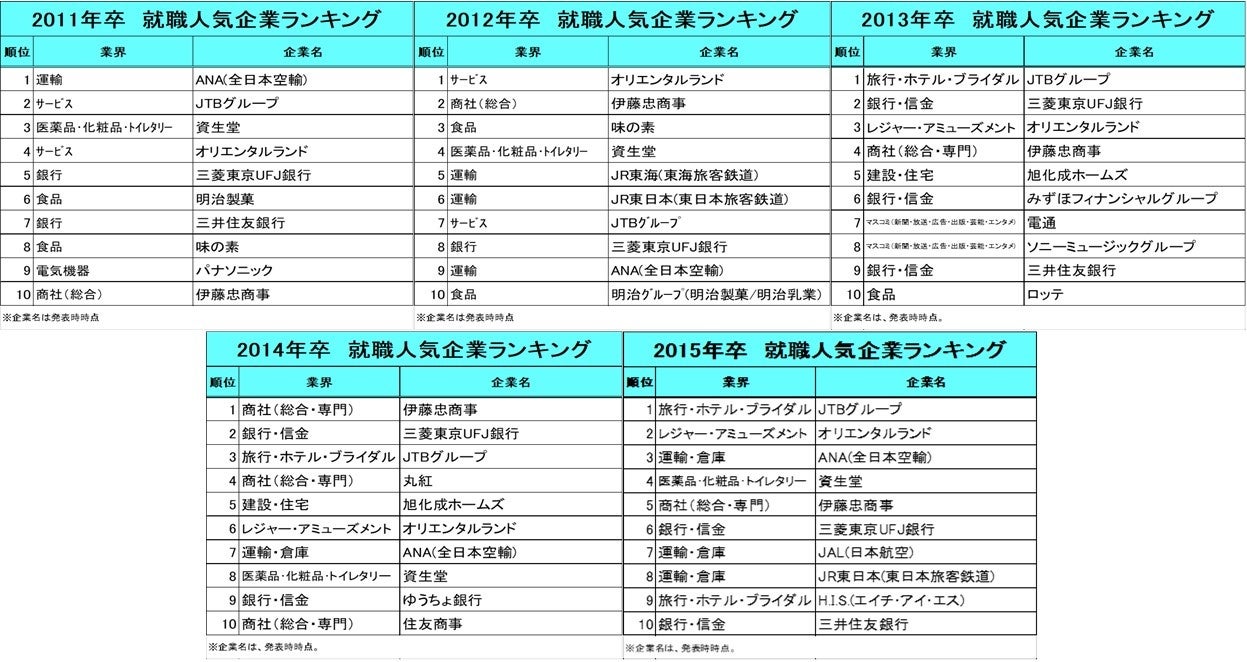 2011年卒~2015年卒のランキングでは、ANA(全日本空輸)やJAL(日本航空)、JTBグループ、オリエンタルランドなど「旅行」「航空」関連の企業が上位を占める結果に。また、三菱東京UFJ銀行(現:三菱UFJ銀行)や三井住友銀行など金融もトップ10の常連となっています。