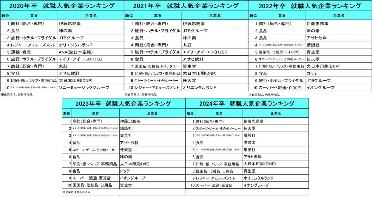 2020年卒~2024年卒は、5年連続で伊藤忠商事が首位を独占。任天堂は、2021年卒で9位に入って以降、2022年卒6位、2023年卒5位、2024年卒2位と年々順位を上げています。2022年卒のランキング(2020年調査)以降、講談社や集英社もトップ10の常連となりました。ゲームや電子コミック、動画など、デジタルコンテンツを提供する企業が、デジタルネイティブである学生から支持を集めていることが分かります。