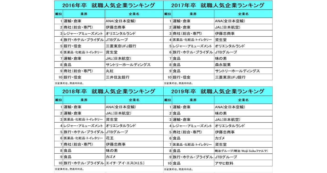 2016年卒~2019年卒は、ANA(全日本空輸)が4年連続で首位を獲得。JAL(日本航空)もトップ10に入っており、現在の社会人4年目から7年目にあたる世代が就職活動をしていた時期は、「航空」が高い人気を誇っていたことが伺えます。JTBグループや、オリエンタルランドなど、旅行関連も人気を集めていました。