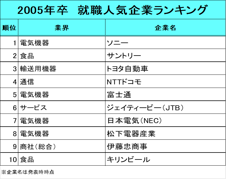 就職人気企業ランキング20年比較/20年前は、ソニー、サントリー、トヨタ自動車がトップ3に。電機・食品・消費財などメーカーが人気。メーカー⇒金融⇒旅行・航空⇒デジタルコンテンツと人気業界が変化の傾向