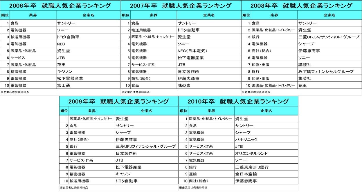 2006年卒~2008年卒のトップは、3年連続サントリー。2009年卒と2010年卒は2年連続で資生堂が首位となりました。「食品」「消費財」の他、「電気機器」や「自動車」など、メーカーが上位を占める傾向が続きます。