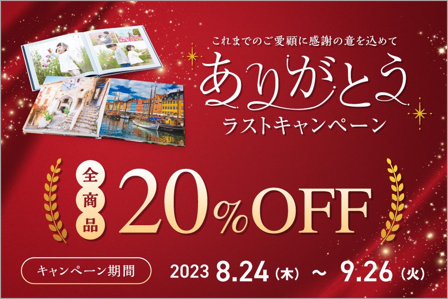 キヤノンのフォトブックサービス「PhotoJewel S」は、2023年10月3日(火)をもって、サービスを終了することとなりました。これまでのご愛顧に感謝し、全商品を対象にした20%OFFキャンペーンを実施します。