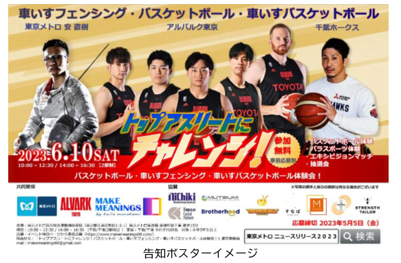 東京地下鉄株式会社(本社:東京都台東区、代表取締役社長:山村 明義、以下「東京メトロ」)とトヨタアルバルク東京株式会社(本社:東京都文京区、代表取締役社長:林 邦彦)が運営する男子プロバスケットボールクラブであるアルバルク東京及びMAKE MEANINGS(東京都江東区、代表:村上 慶太)は、共同で「トップアスリートにチャレンジ!バスケットボール・車いすフェンシング・車いすバスケットボール体験会!」を2023年6月10日(土)に開催します。