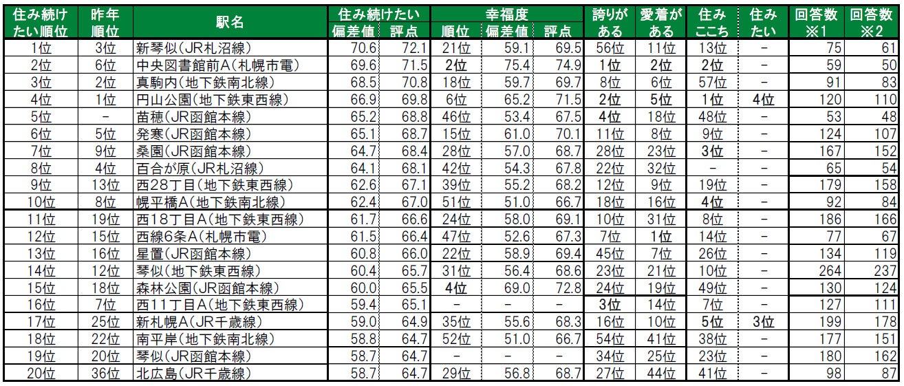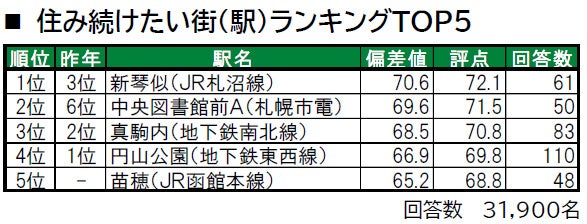 1位は札幌市北区に位置する新琴似で、唯一偏差値70台の高い評価を得ています。2位は中央図書館前Aで、「住み続けたい街(自治体)」3位の札幌市中央区に位置し、「街に誇りがある」1位、「住みここち」「街の幸福度」「街に愛着がある」2位と、各ランキングで高評価を得ている駅です。3位は、札幌市南区に位置する真駒内です。