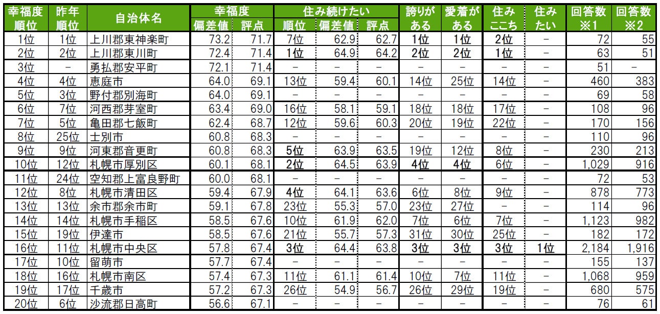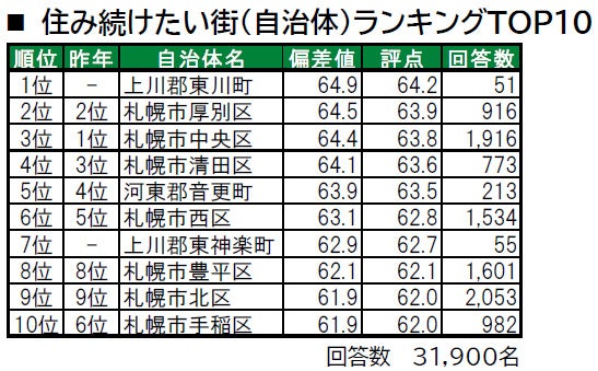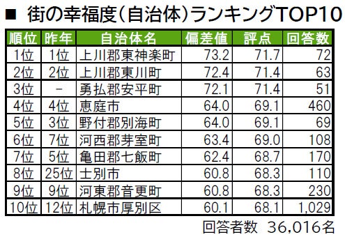 ●トップ10内では、上川郡に属する東川町と東神楽町が新たにランクインしています。いずれも昨年は累計回答数が50名未満でランキング集計対象外だった街です。東川町と東神楽町は、「街の幸福度」でトップ2となっています。