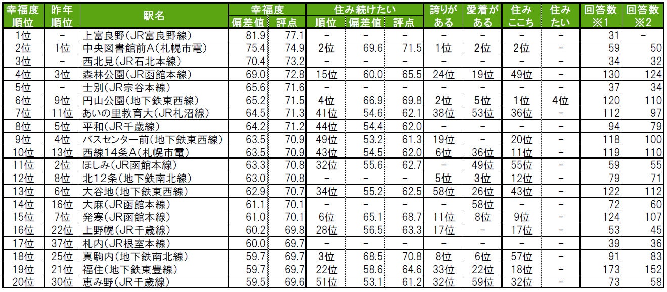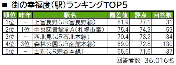 1位は、空知郡上富良野町に位置する上富良野で、唯一偏差値80台の極めて高い評価を得ています。2位は札幌市中央区に位置する中央図書館前Aで、「街に誇りがある」1位、「住みここち」「住み続けたい街」「街に愛着がある」2位と、各ランキングで高評価を得ています。3位は北見市に位置する西北見で、1位と3位の駅は、昨年は累計回答数が30名未満でランキング集計対象外だった駅です。