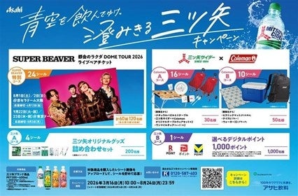 3月16日から実施する「青空を飲んでゆけ。澄みきる三ツ矢キャンペーン」は、「三ツ矢」ブランドの商品を購入して応募することができます。抽選で「SUPER BEAVER」の「都会のラクダ DOME TOUR 2026」のライブペアチケットが60組120名に、「Coleman」とコラボレーションしたアウトドアグッズが80名に、三ツ矢オリジナルグッズ詰め合わせセットが200名に当たります。TVCMと連動したキャンペーンを通じて商品の購入喚起を図ります。