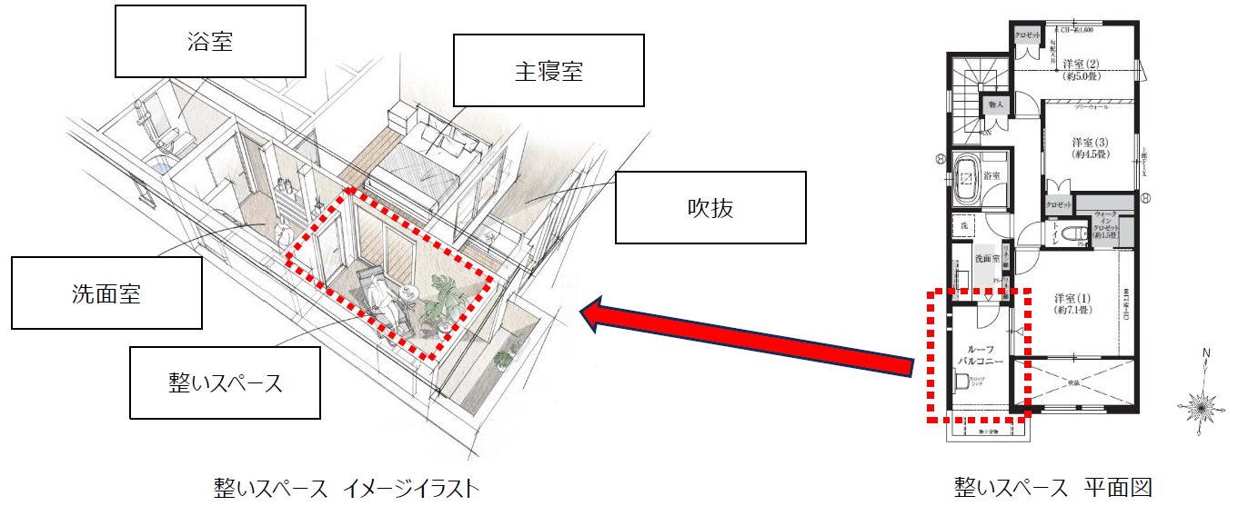 浴室隣の「整いスペース」※1は、洗面および主寝室と直結する屋根付きルーフバルコニー。外気浴により入浴後に火照った身体をクールダウンさせ、疲労回復やストレス緩和に寄与。