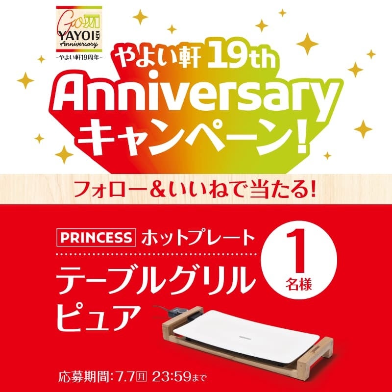 このたび日本国内の「やよい軒」では、7月に19周年を迎えます。そこで19周年を記念し、やよい軒公式X・公式Instagramにおいて、Xでは「やよい軒お食事券」、Instagramでは「PRINCESS ホットプレート テーブルグリルピュア」が当たる!『19周年Anniversary』キャンペーンを実施いたします。ぜひ、この機会にキャンペーンにご参加ください。