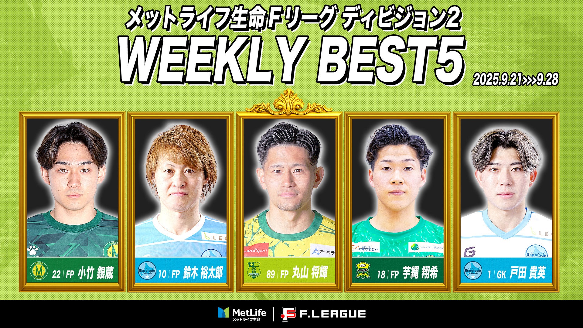 9月21日(日)〜9月28日(日)に実施したメットライフ生命Fリーグ2025-26 ディビジョン2 第10節におけるベスト5をお知らせいたします。