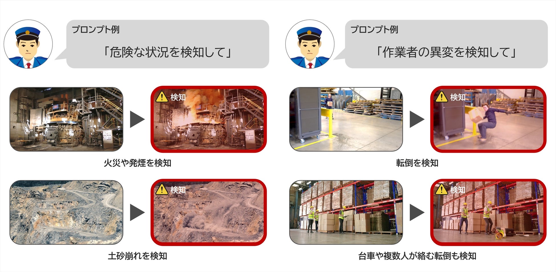 VLMは大量の画像データによるAIモデルの学習を必要とせず、プロンプト(自然言語)による条件設定が可能です。たとえば、「人が倒れている状態を検知対象とする」といった自然言語で異常状態のルール設定が可能となるため、従来よりも柔軟に検知ルールの構築/管理が可能になります。