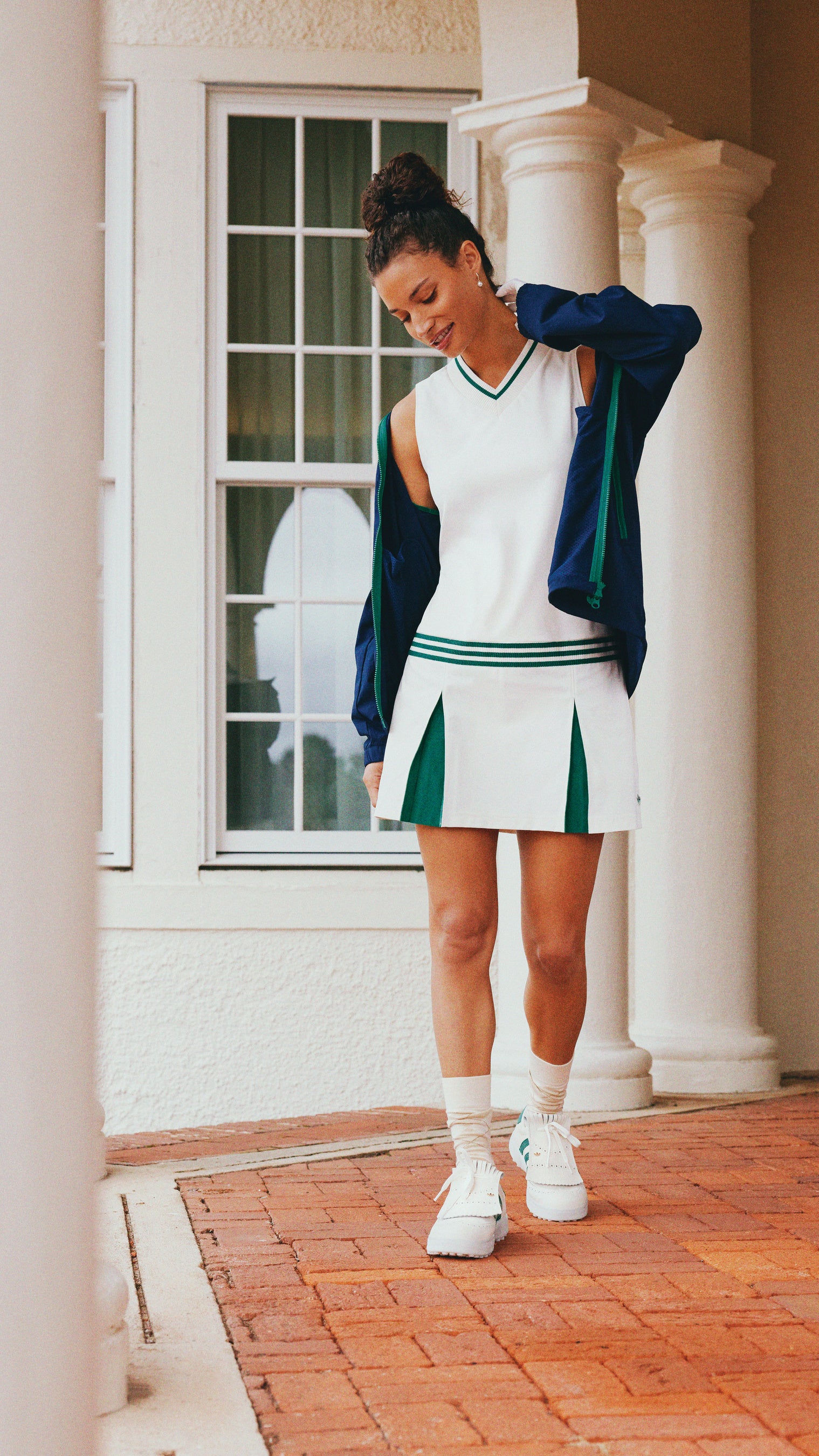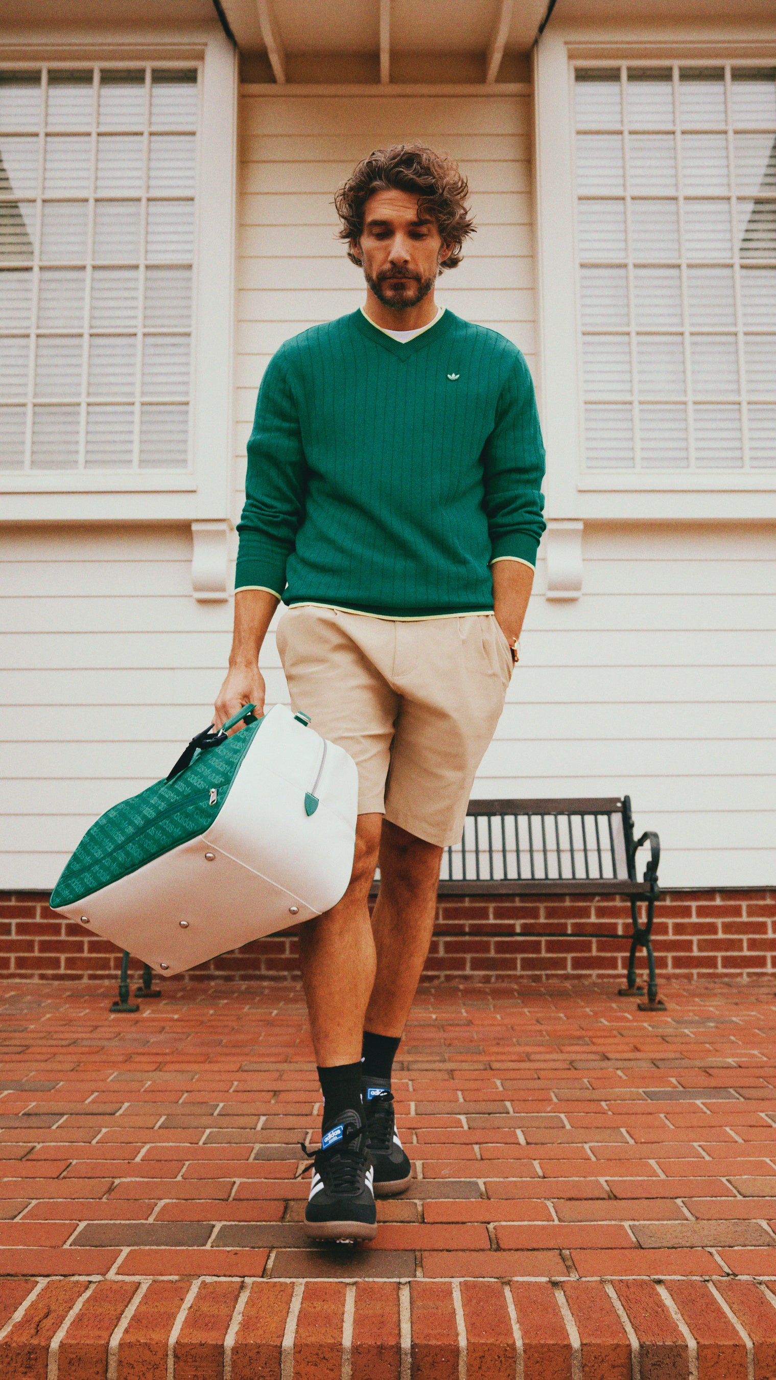 今年最初のメジャートーナメントに合わせたコレクションでは、ブルー、ホワイト、グリーン、イエローを組み合わせたカラーパレットを採用しています。メンズコレクションでは、レジェンドたちにインスパイアされたセンタープレス仕様のワイドパンツの他、ジャカード織りのトーナルアーガイル柄が特徴のニットポロシャツ、トレフォイルのプルが付いたハーフジップスウェットなどのレイヤリングアイテムも充実しています。ウィメンズは、Vネックとスリーストライプスのバンドディテールがアイコニックなノースリーブワンピースの他、ウエストにコントラストカラーのパイピングを施したプリーツスカートやカシミア混のクルーネックセーターなどをラインナップしています。