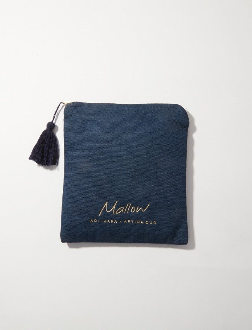 ARTIDA OUDのオンラインストアで、コラボジュエリーを1点以上ご購入いただいた方限定で、先着300名さまにポーチをプレゼント。伊原氏本人の描いた今回のコレクション名「Mallow」をプリントしたポーチが付きます。