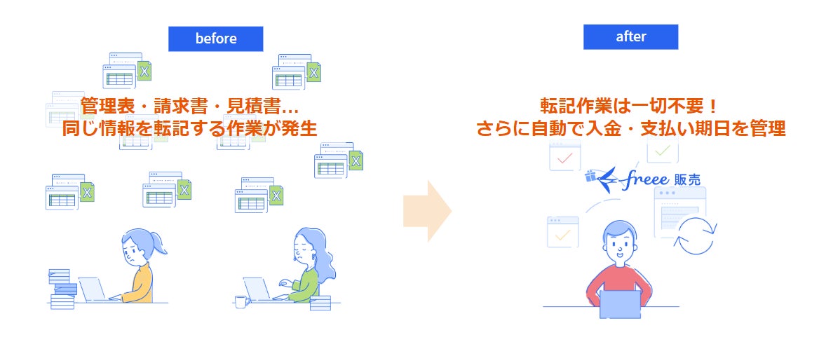 従来の販売管理は複数のExcelやツールで管理することで転記する作業が手間になり、管理が疎かになります。freee販売は最低限の入力のみで転記作業が一切不要。見積書や請求書を作成することで自動で入金・支払いの期日を管理画面上で表示します。
