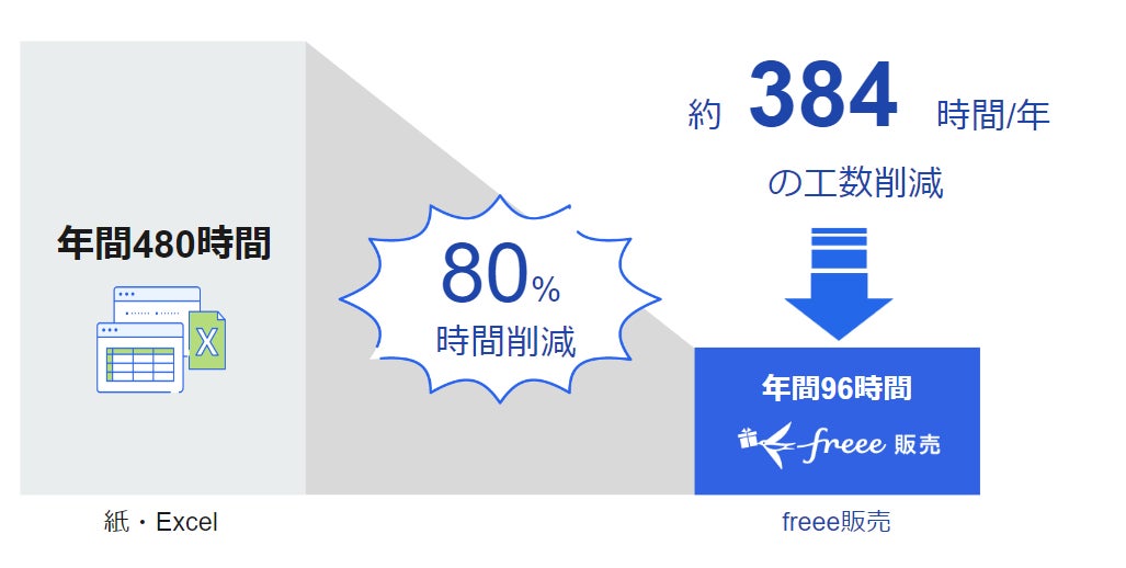 Excelで書類作成した場合年間480時間の工数が発生するのに対して、freee販売を利用した場合年間384時間の工数削減が可能(※)となります。