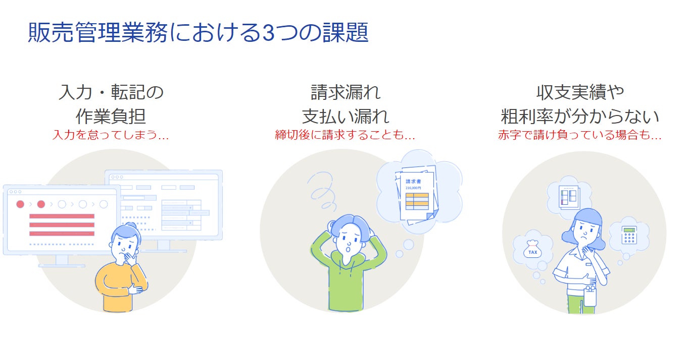 従来の販売管理業務には大きく3つの課題が挙げられます。1つ目は、「入力・転記作業の負担」です。紙・Excelへの細かい入力やツールの分断による繰り返される入力など手間が発生します。2つ目は、「請求漏れ・支払い漏れ」です。小規模事業者の場合、専任の経理担当が不在で経営者もしくは現場担当者が請求書の作成などを行うことが多く、事務作業を後回しにしてしまい結果漏れてしまうことが発生します。3つ目は、「収支実績や粗利率が分からない」です。受注した案件を納品してから人権コストや仕入価格を整理し原価を洗い出してみると実は赤字で請け負っていたケース等もあります。