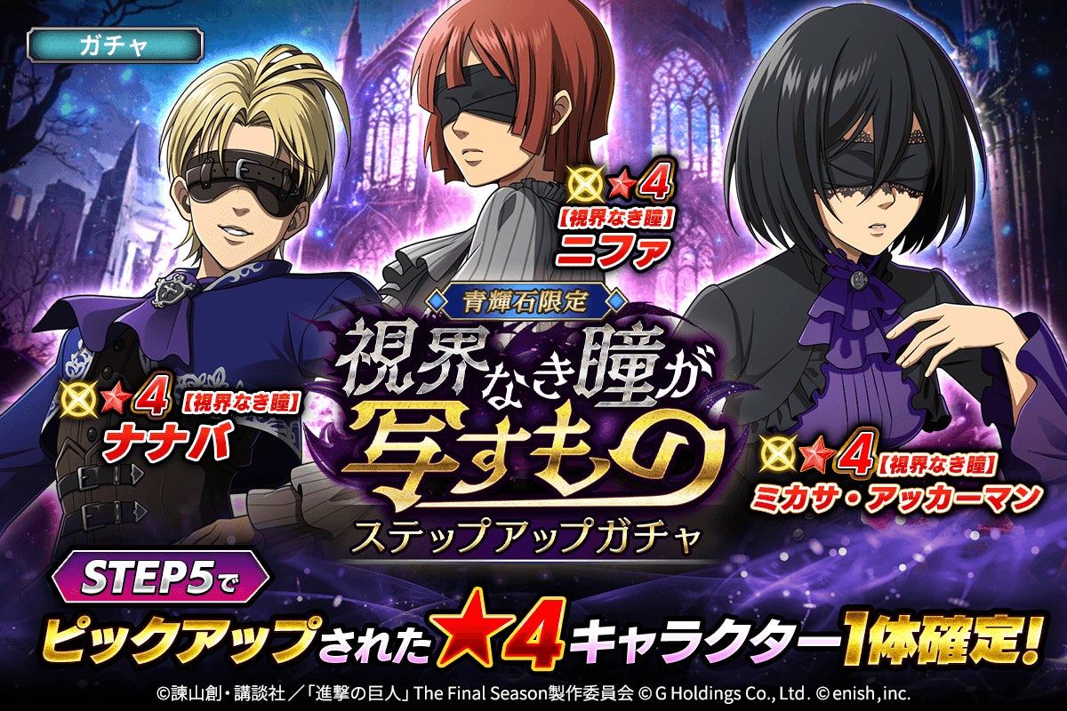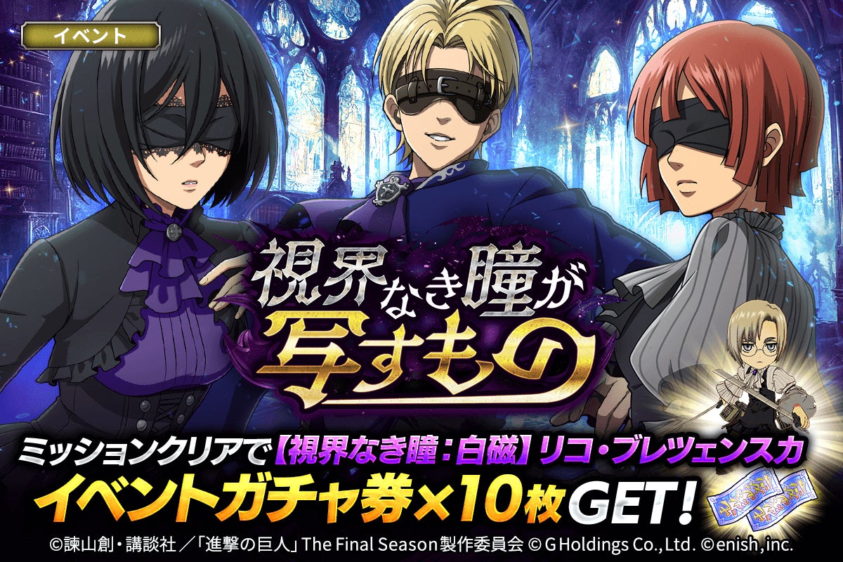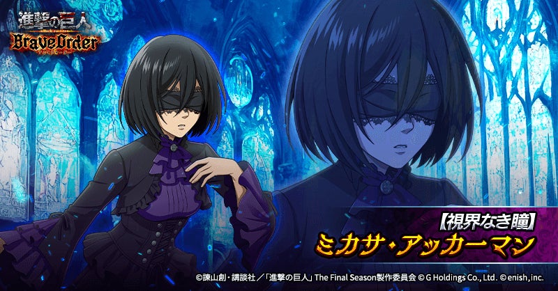株式会社enish(本社:東京都港区、代表取締役社長:安徳 孝平、以下enish)は、アニメ『進撃の巨人』のスマートフォンゲーム最新作「進撃の巨人Brave Order」にて、2025年3月28日(金)より、「視界なき瞳が写すもの」を開催!また、本日より新登場の【視界なき瞳】ミカサ・アッカーマン、【視界なき瞳】ナナバ、【視界なき瞳】ニファがピックアップされた「視界なき瞳が写すものガチャ」も開催!その他、最新情報はゲーム公式サイト・ゲーム公式X(旧Twitter)アカウントにて随時公開して行きますので、ぜひご覧ください。
