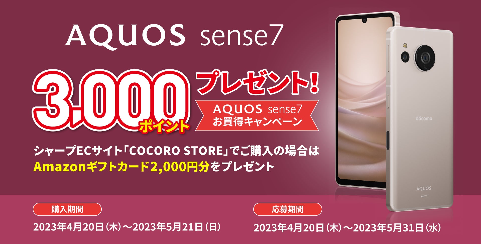 期間中(2023年4月20日(木)~2023年5月21日(日))に、NTTドコモまたは当社のCOCORO STOREにて「AQUOS sense7」をご購入の上、専用サイトからご応募(※1)いただいたお客様に、dポイント3,000ポイント(NTTドコモの場合)、またはAmazonギフトカード 2,000円分(当社のCOCORO STOREの場合)をもれなくプレゼントします。