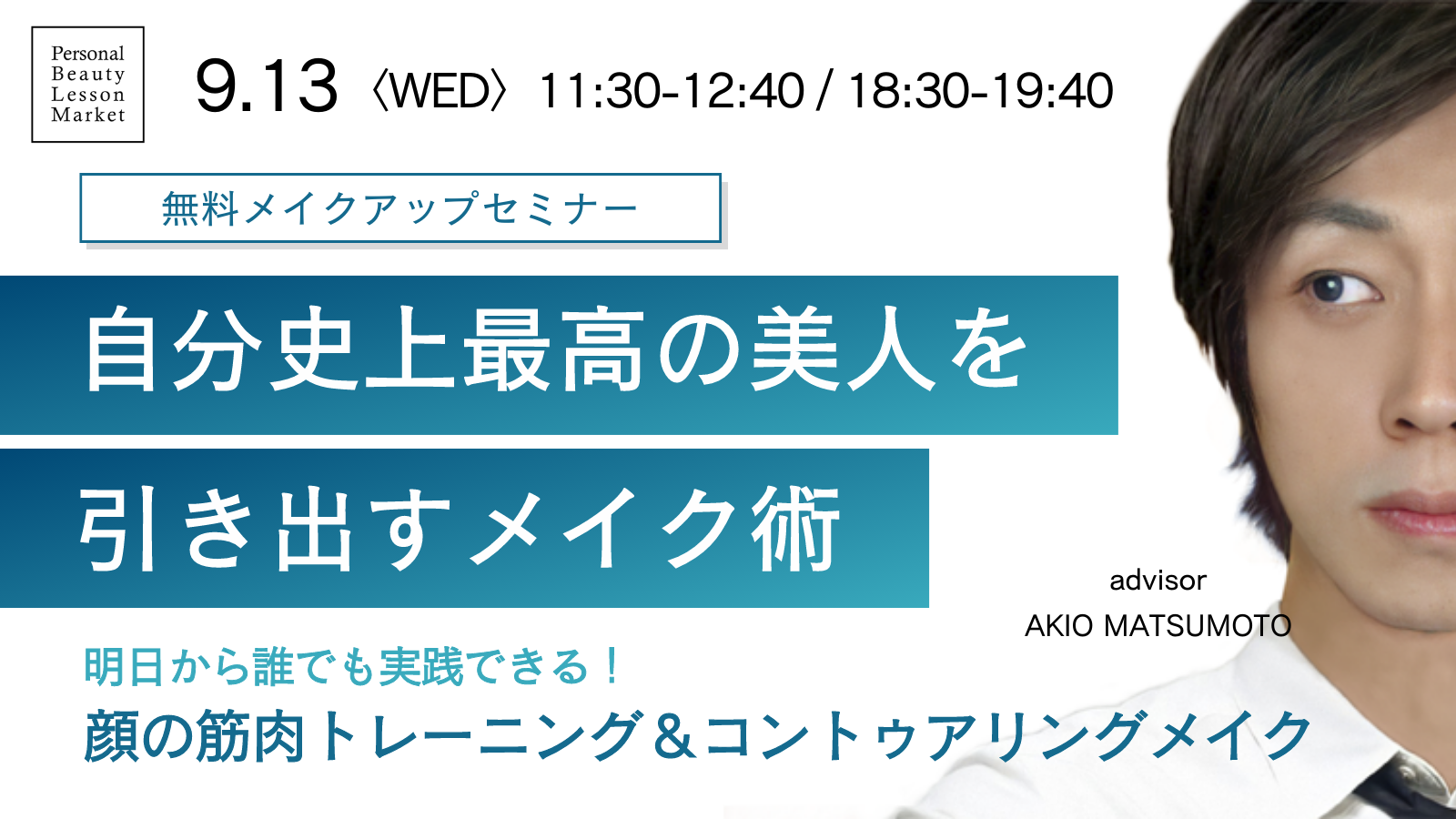 本イベントでは、メイクアップアーティストで本サービス講師の松本あきお氏が、自分史上最高の「美人」になれるメイクテクニックをご紹介します。「顔の筋肉トレーニング」と「コントゥアリングメイク」の2つのテーマに沿って、多くの芸能人のヘアメイクを担当してきた松本氏だからこそレクチャーできる、一人ひとりの「美人」を引き出すメイクテクニックを紹介します。