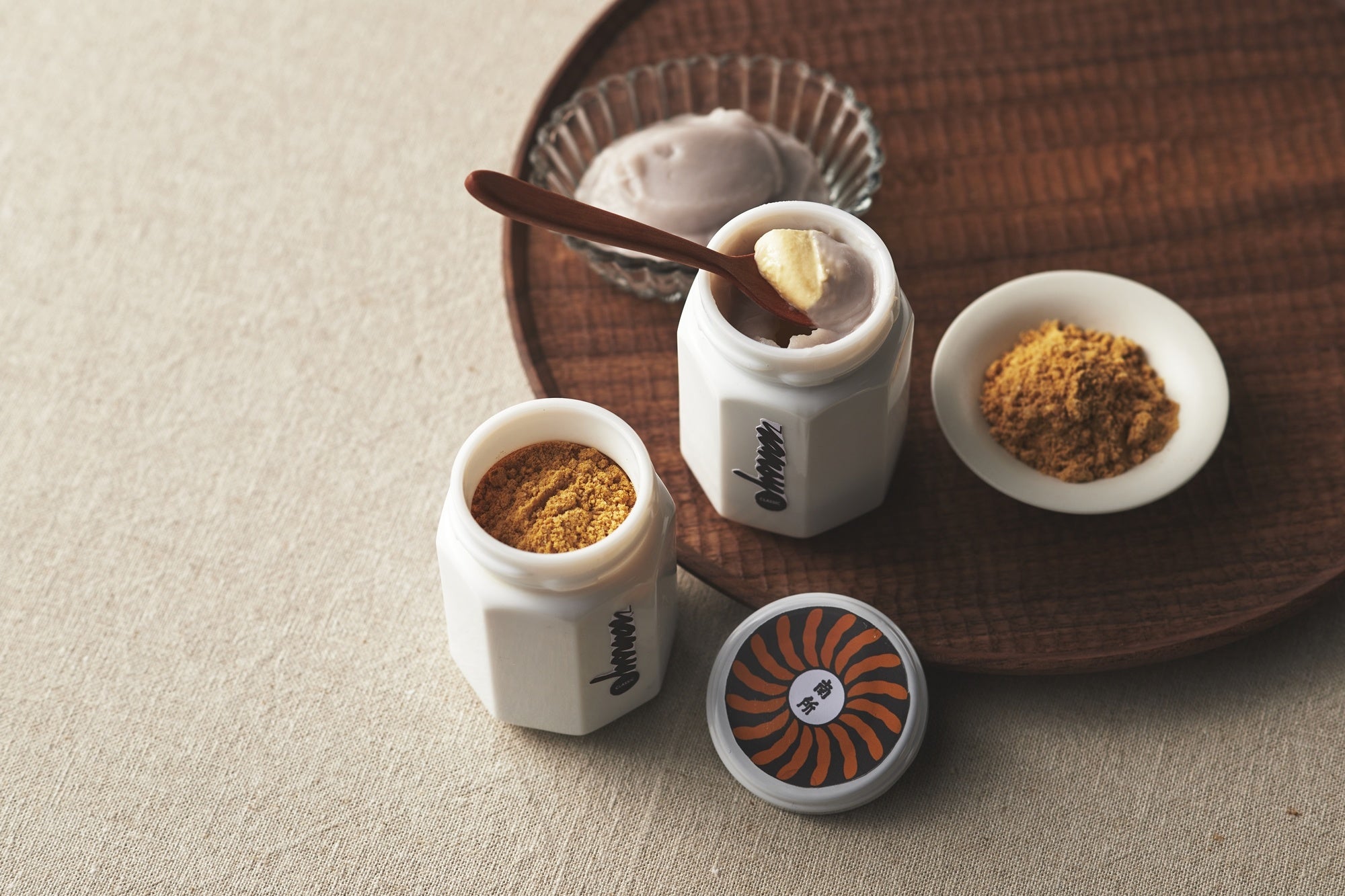台湾でポピュラーなタロイモのペーストか、小麦粉にピーナッツや白ごまを混ぜたきな粉のようなパウダー“麺茶”のどちらかをお好みでトッピング。
