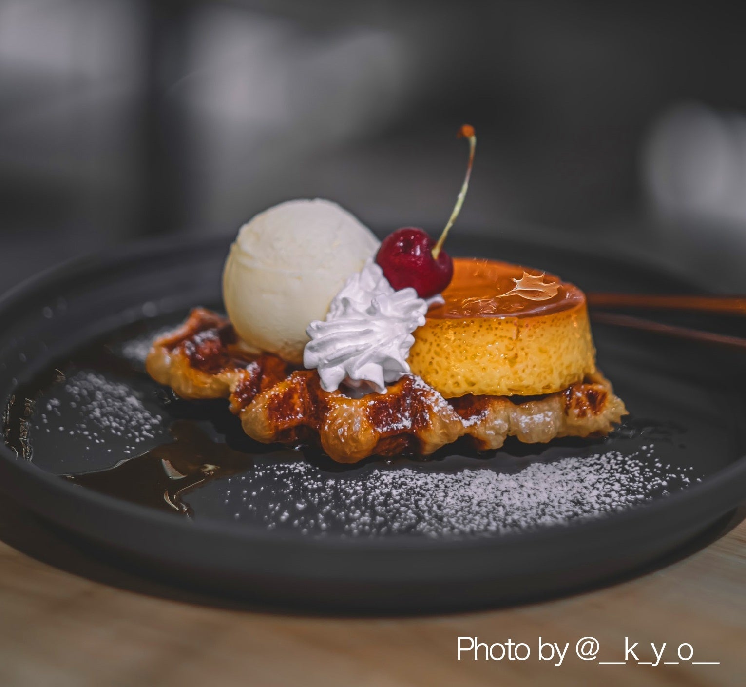 オーストラリアと韓国でカフェ経営経験のあるオーナーが、オーストラリアのカルチャーを世界に発信するために、京都・神戸・シドニーにオープン。韓国で大人気の、クロワッサンの生地で作ったワッフル“クロッフル”に、プリンとバニラアイスをのせてカラメルソースをとろ~り。