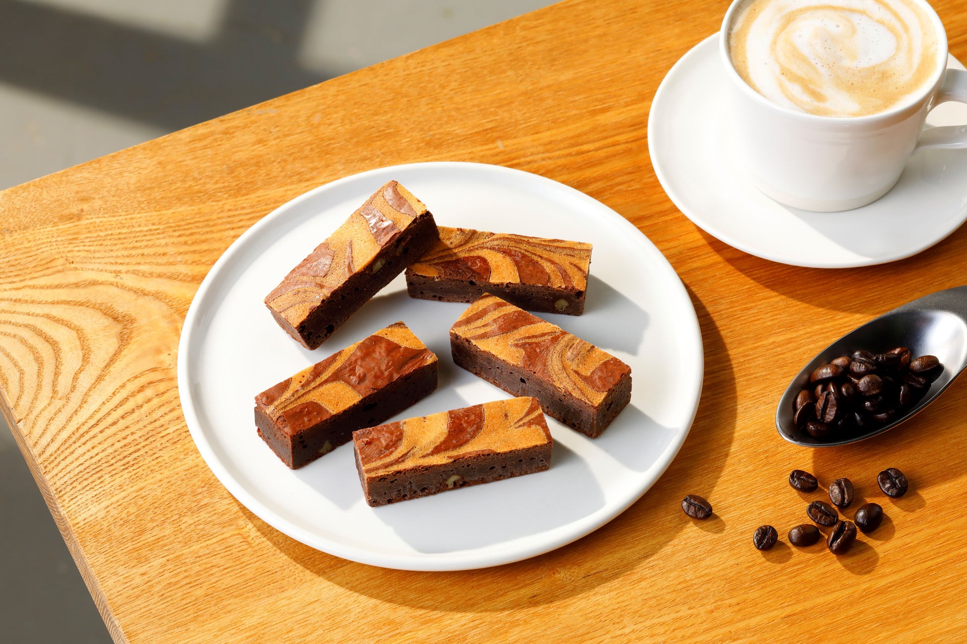 ブラウニーは、厳選した2種類のクーベルチュールチョコレートとブラジル産コーヒー豆を練り込んだほんのり苦味のきいた味わいに仕上げ、アクセントにくるみを加えました。